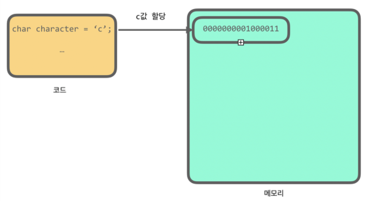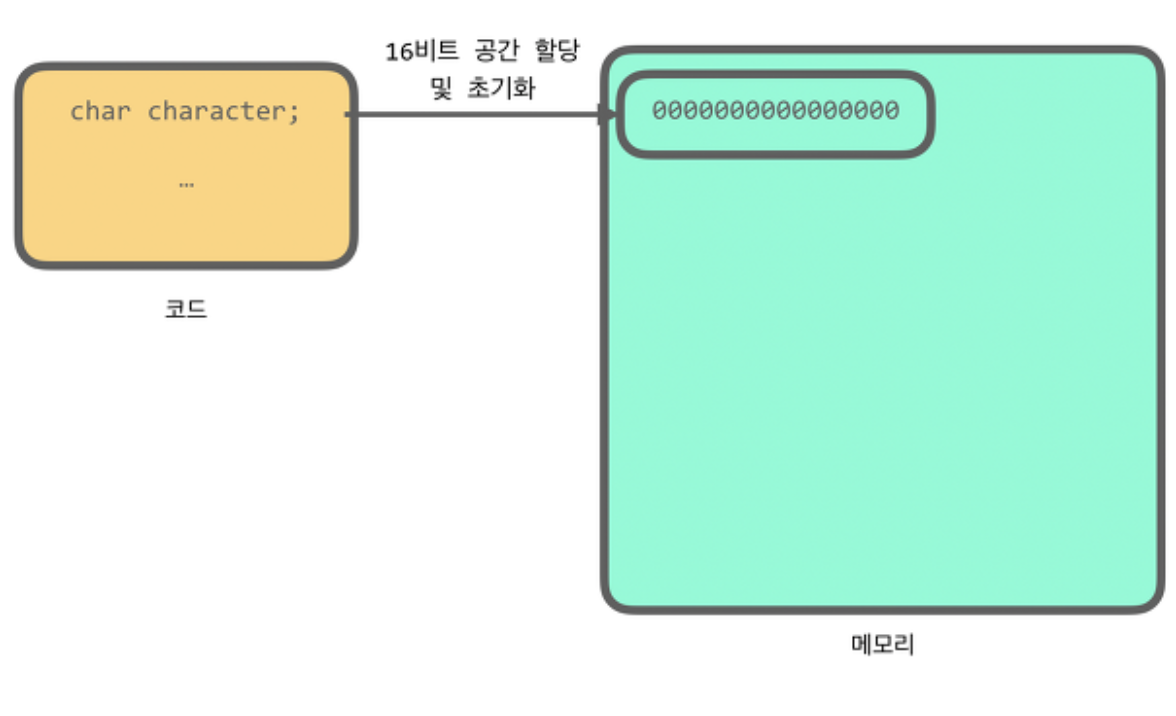 char의 자료형의 크기는 16비트=2바이트이다. 코드를 실행시키면 컴퓨터가 char character;을 선언한 부분을 실행시키고, 컴퓨터는 메모리 영역에 16비트(2바이트)공간을 확보한다. 이후 'c'를 선언해주면 c값을 16비트가 할당된 공간에 c의 바이너리값(0000000001000011)으로 메모리 공간을 덮어 쓴다.