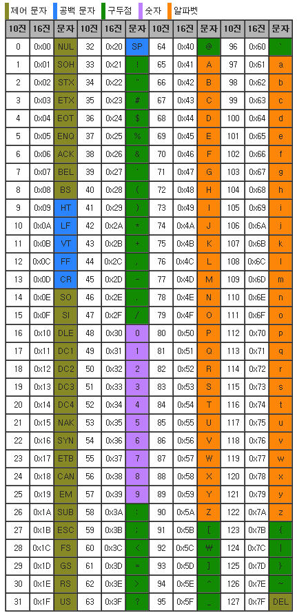 ASCII Code(아스키 코드): 영문 알파벳을 사용하는 대표적인 Character Encoding. ※컴퓨터와 통신장비를 비롯한 문자를 사용하는 장치들에 사용되고 있음. ※33개의 출력불가능한 제어문자들(대부분 더이상 사용되지않음)+공백포함 95개의 출력가능 문자들로 구성된 000(0x00)~127(0x7F)까지의 총 128개의 문자들. ※영문 키보드로 입력할 수 있는 모든 기호들이 할당되어 있는 부호체계※매우 단순, 간단하여 어느 시스템에도 적용가능
